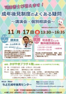 また、講演会後は司法書士に無料で相談できる個別相談会も実施します。こちらでは成年後見制度のみならず、相続や遺言についても相談できます。
