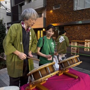 神田囃子の体験では、みなさんに交じって、私たち職員も演奏をさせて頂きました。