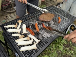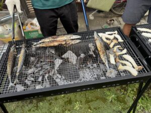 午後のバーベキュー大会では炭火で焼いた、秋の味覚さんまやお肉、おいしい野菜が振舞われました。