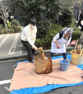 餅つき大会の始まりです。ぺったん、ぺったん美味しいお餅ができるのが楽しみです!