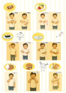 そば・ラーメン・うどん・ケーキ・たこ焼き・オムライス・かっぱ巻き・いかのお寿司・カレー・ハンバーガーの手話を教えてもらいました。