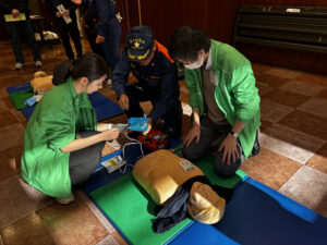 まずは神田消防署の方から救命のための、胸骨圧迫とAEDの使い方について講習がありました。