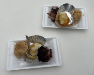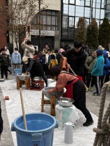ほかほかのお餅は女性陣が丸めて大根おろし・あんこ・きな粉で味付け、男子陣が参加者に配布。