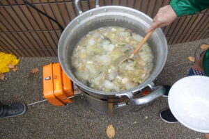 防災イベントとして炊き出し(ちゃんこん)試食・備蓄食品配布が出来ました。