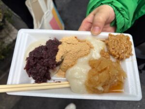 お餅のトッピングは、きなこ、あんこ、大根、納豆と様々です。