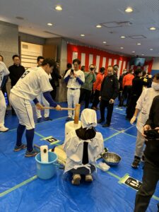私たちがお邪魔したタイミングで餅つきをしていたのは、野球選手、ラグビー選手、ボート選手のみなさん。