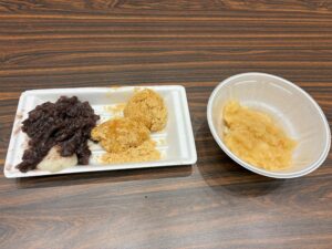 つきあがったお餅は、あんこ・きなこ・大根おろしの3種類でした。