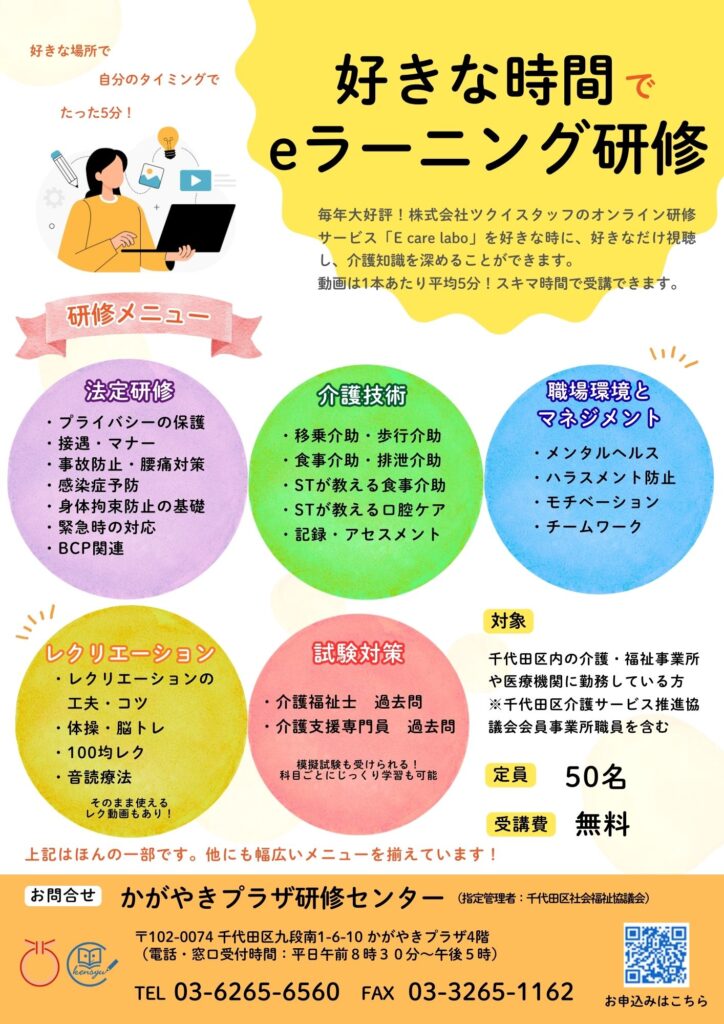 毎年大好評!株式会社ツクイスタッフのオンライン研修サービス「E care labo」を好きな時、好きなだけ視聴し、介護知識を深めることができます。