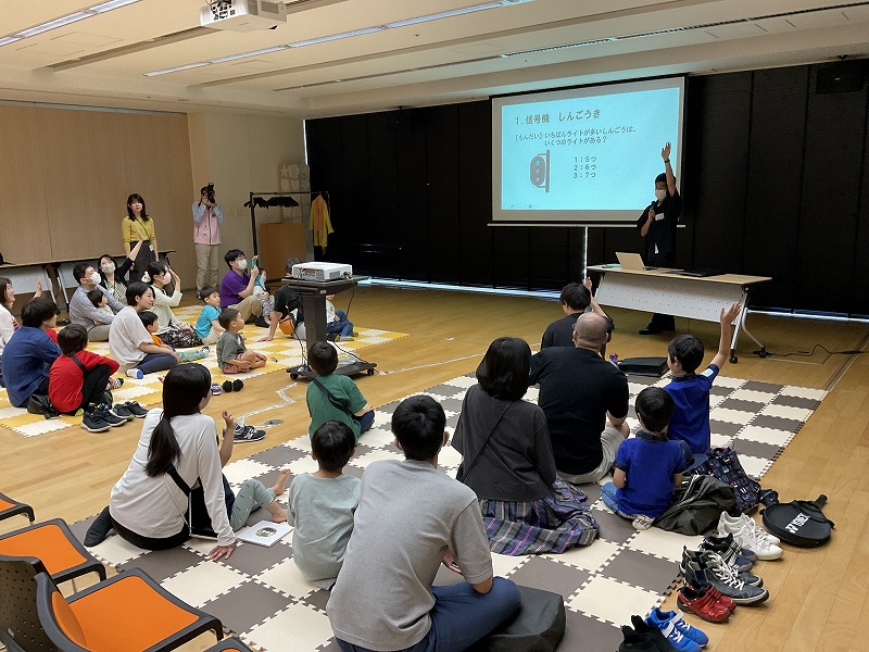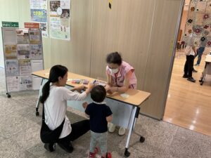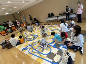 当日は電車が大好きな子どもを中心に電車が好きな人が集まり、みんなで電車クイズを楽しんだ後はプラレールや電車のぬり絵、Nゲージの運転を楽しみました。比較的小さな子どもが多かったせいか、この日はプラレールが大人気。あっという間に2階建ての線路を作ったり、長~く線路をつなげたり、線路の切り替えを楽しんだり。大学生のお兄さん、お姉さんに見守られながら、みんな仲良く遊べていました。