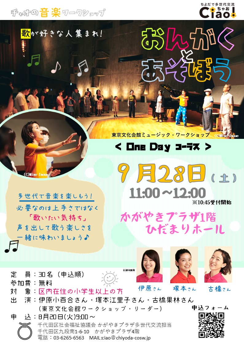 今回のレポートは9/28(土)のチャオの音楽ワークショップ「おんがくとあそぼう~One Day コーラス~」です。この企画は東京文化会館さんとの共催企画で今年度3回予定しているうちの第2回目です。