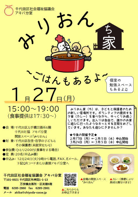 会場:万世橋出張所6階 ちよだ社協アキバ分室 開放スペースみりおん(外神田1-1-13)