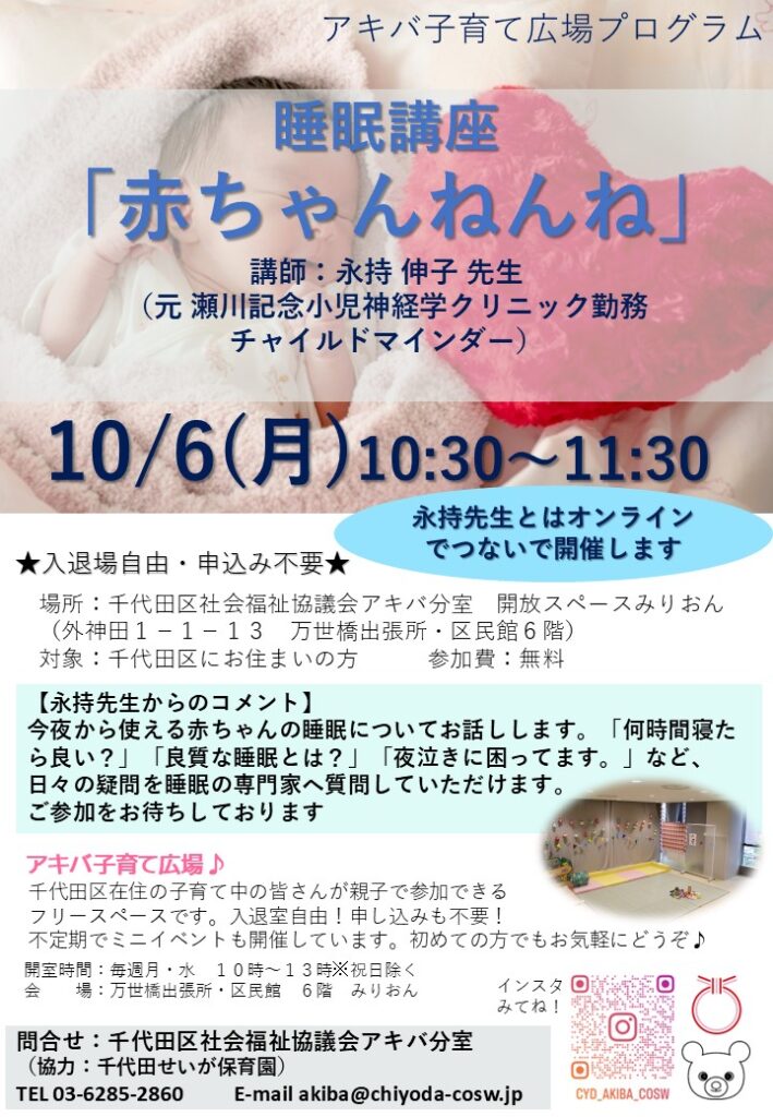 10/6(月)睡眠講座「赤ちゃんねんね」アキバ子育て広場プログラム