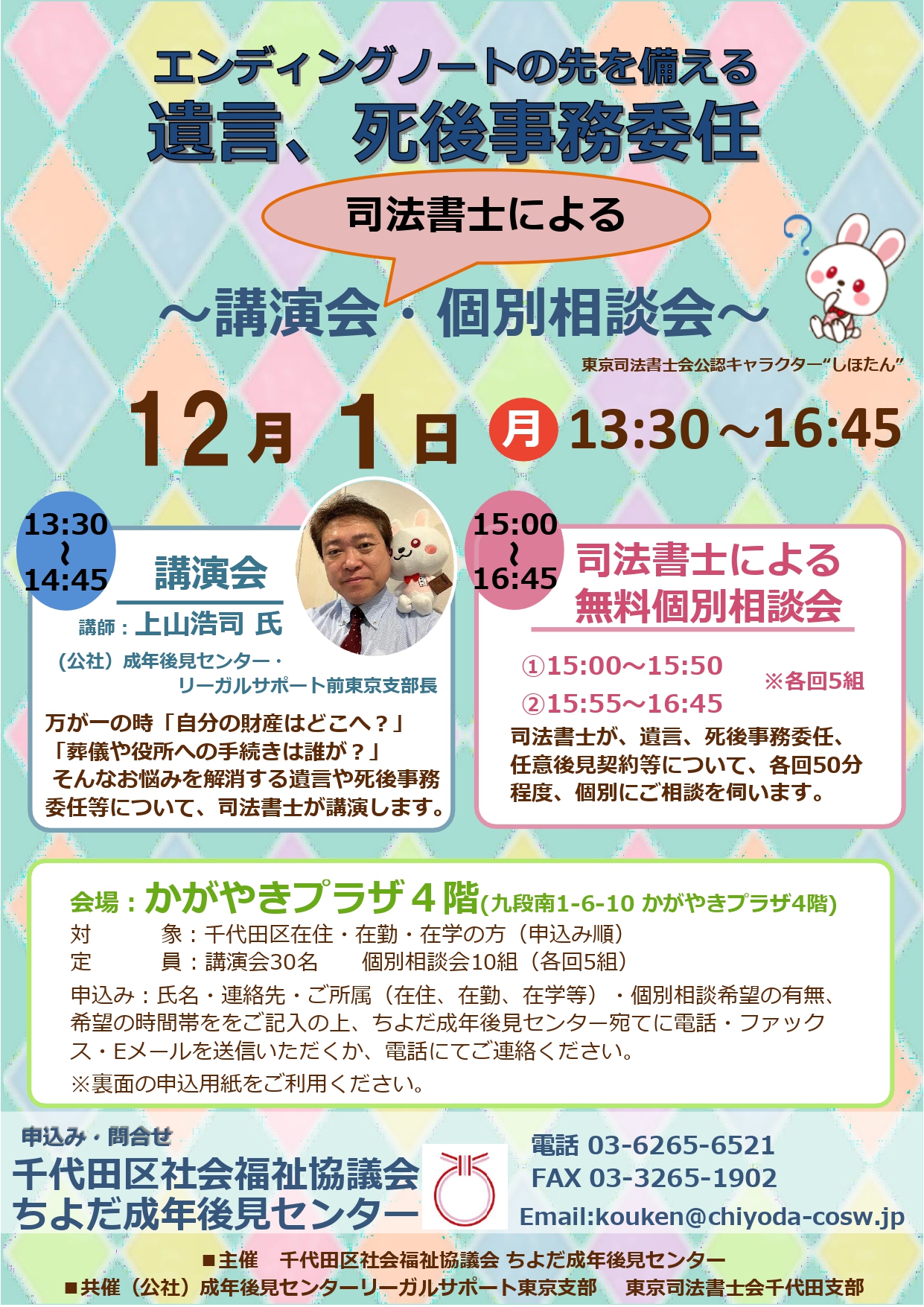 司法書士の先生による講演会と個別相談会を企画いたしました。将来に向けてご活用いただけると嬉しいです!