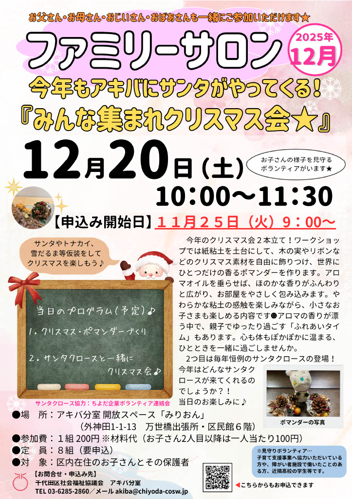 12月ファミリーサロン「今年もアキバにサンタがやってくる!『みんな集まれクリスマス会★』」のご案内★