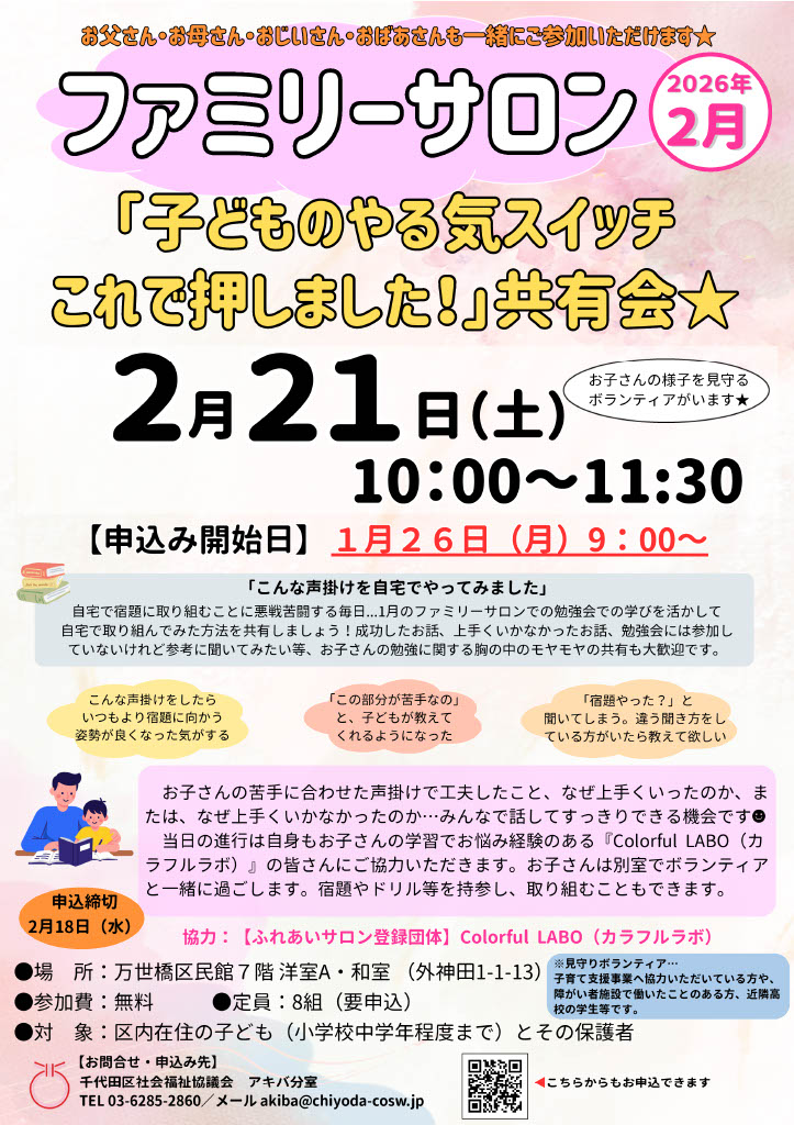 【1月26日(月)予約開始】2月ファミリーサロン『 「子どものやる気スイッチこれで押しました!」共有会★』のご案内★